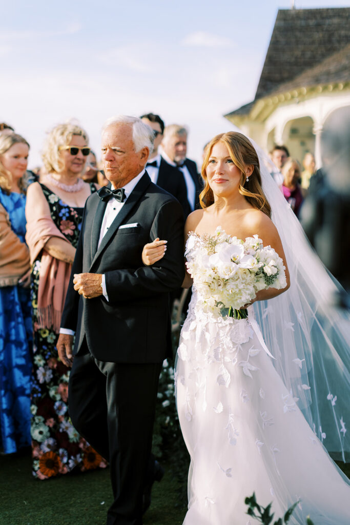 Lush arrangements of white blooms and textured greenery were layered at varying heights, giving the design movement while keeping everything grounded. This approach to ceremony florals is ideal for outdoor coastal weddings, it creates impact without overwhelming the scenery and photographs beautifully from every angle.